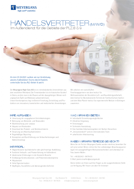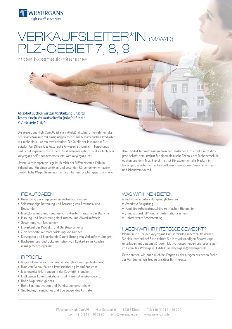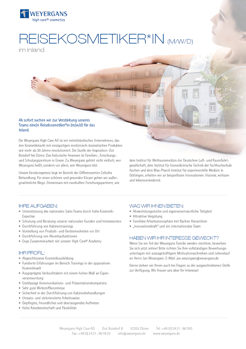 Richten Sie Ihre vollständigen Bewerbungsunterlagen bitte an Jan Weyergans (jan.weyergans@weyergans.de) oder rufen Sie für einen Erstkontakt gerne an: 0172 – 9003008 (Rudolf Weyergans). Sperrvermerke werden selbstverständlich beachtet.